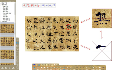 筆畫、單字與原帖相互提取,包含:單字到碑帖、單字到筆畫、筆畫到原碑帖、碑帖到單字相互提取;便于教師講解筆畫在單字、單字在原帖中的章法關系,及碑帖賞析與講解。
