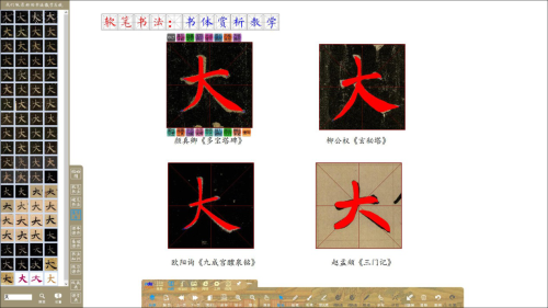 可使用筆順示例和示范動畫,動靜態(tài)結合講解正確書寫筆順,還可播放名家書寫視頻,從不同角度講解;或連接書法教學儀進行教師書寫示范,直接在電子白板/觸控一體機上示范書寫技法。教師在示范教學的過程中,任意形式的教學內容都可以一鍵截取到參照窗口,參照內容可包括:筆畫、單字、碑帖;PPT、視頻、動畫、圖片;作業(yè)、掛圖、課本等。參照窗口與書寫窗口可進行移動及縮放。