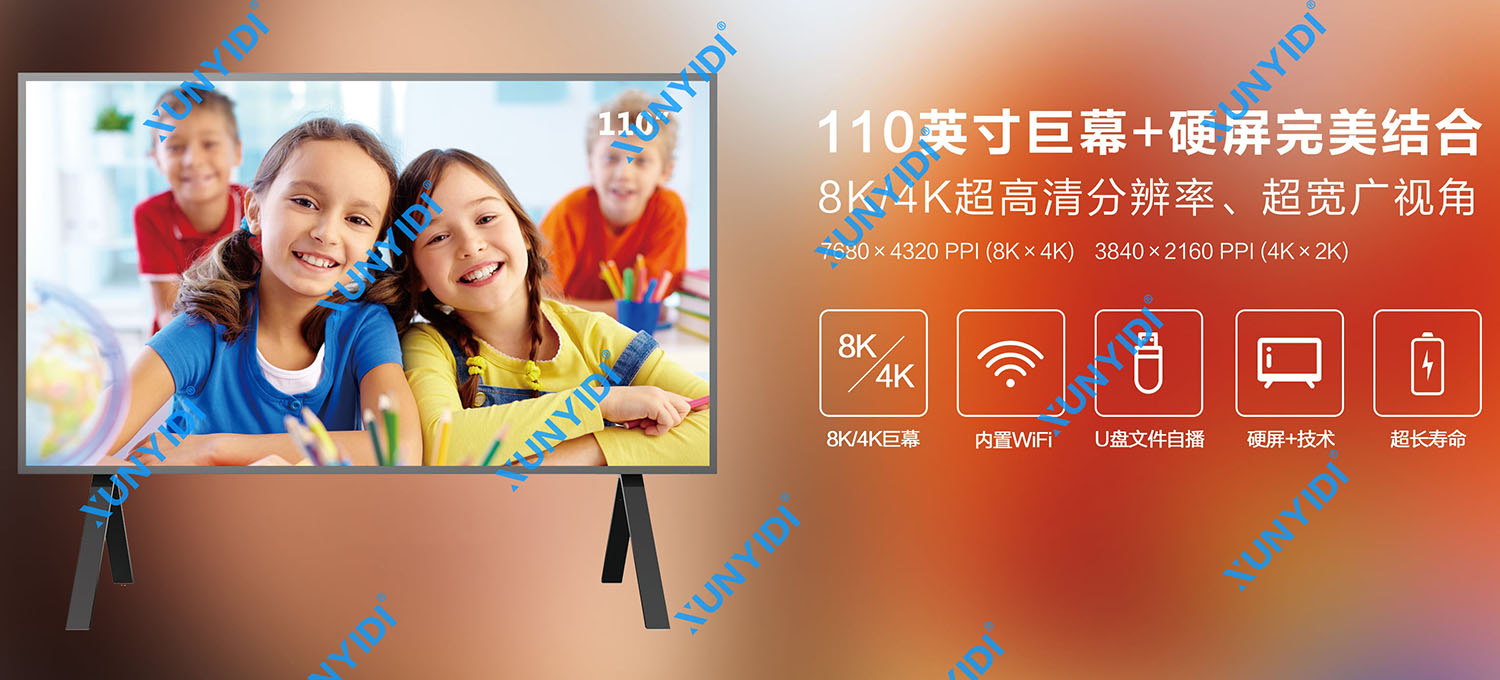 110英寸8K/4K商業顯示器是專門為各類會商室、會議室、大型報告廳、決策室、指揮控制室以及各類展覽展示中心等場所設計的一款高端顯示產品,它與比傳統的顯示相比具有不可比擬的優勢和完美的顯示效果。其采用了 8K /4K超高清屏幕,畫質細膩流暢,清晰無色差,搭載了京東方特有的圖像降噪、智能控光以及區域控光技術,內置WiFi,安卓系統提供了網頁瀏覽、無線傳屏以及應用擴展等功能。因為超大尺寸以及172Kg的重量,該商業顯示器采用坐立式底座以提供足夠的支撐。
