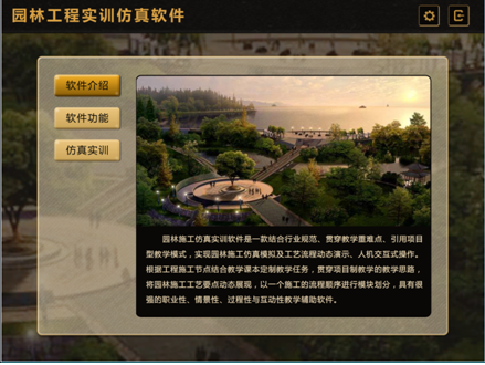 園林施工仿真實訓軟件是一款結合行業規范、貫穿教學重難點、引用項目型教學模式,實現園林施工仿真模擬及工藝流程動態演示、人機交互式操作。根據工程施工節點結合教學課本定制教學任務,貫穿項目制教學的教學思路,將園林施工工藝要點動態展現,以一個施工的流程順序進行模塊劃分,具有很強的職業性、情景性、過程性與互動性教學輔助軟件。