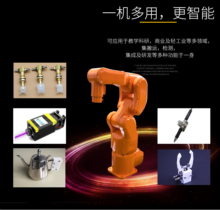 產(chǎn)品詳細(xì)介紹輕量化、微型化、功能全;是濃縮了企業(yè)一線制造車間用的工業(yè)機(jī) 器人所有的基本功能,真實(shí)的機(jī)器人控制系統(tǒng),與 ABB/安川等品牌機(jī)器人編程語言規(guī) 則相似,提高學(xué)生編程能力�?纱钆湮瑾{服飾或?qū)懽謯A具、吸盤,用于娛樂或觀賞應(yīng)用 編程學(xué)習(xí)和機(jī)器人寫字或搬運(yùn)碼垛編程應(yīng)用。六自由度機(jī)器人是一款針對高校教學(xué)應(yīng) 用開發(fā)的六軸機(jī)器人。機(jī)器人結(jié)構(gòu)緊湊、體積小、重量輕、其最大負(fù)載 5KG,臂展活動 范圍540mm。腕部采用中空結(jié)構(gòu),走線更方便、動作更靈活