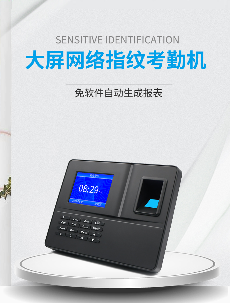產品詳細介紹大屏網絡指紋考勤機,免軟件自動生成報表;無膜指紋采集,真人語音功能,快速識別,10萬條記錄容量,1000枚指紋容量;免軟件安裝只需三步,從此不需要將考勤機連接電腦設置,直接在考勤機上完成簡單設置,只需三步完成即可完成指紋人臉錄入,方便快捷;多種驗證,快速識別,指紋,密碼,可選ID卡,多重識別,簡單門禁功能;核心技術搞定輕松考勤;真人語音提示,讓簽到儀式感增加,正式貼心,支持多國語言,簡繁體中文、英語、西班牙、葡萄牙、韓語;可選停電打卡,斷電照打卡,機器內置電池,停電使用可持續4小時,不擔心考勤丟失;自助報表,多種方式下載,U盤下載,配置標準TCP/IP通訊協議,可聯網查看設置考勤和統計;可設置報表密碼,讓考勤數據更安全。