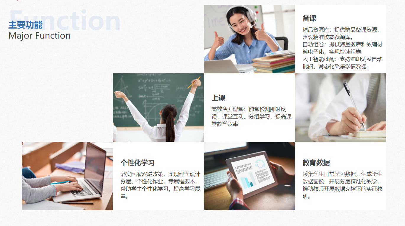 產品詳細介紹堅知果AI課堂,利用學校原有信息化基礎設備,不改變學校紙筆作答教學習慣,采用人工智能、大數據技術實現科學設計分層、個性化作業,課堂數據即時反饋,提高課堂教學效率,PAD智能終端設備無需進課堂,即可實現分層教學、精準化教學。采集學生日常學習數據,生成專屬錯題本、學生數據畫像,助力學生個性化學習。教研備課平臺為教師提供海量精品資源,推動教師開展數據支撐下的實證教研,為教育管理者教學改革、教育決策提供科學準確的數據支撐。