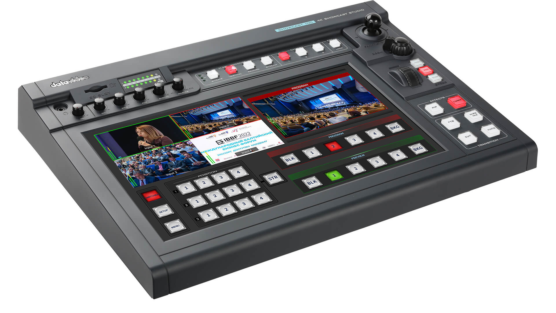 豎屏直播 觀看直播的大眾,有 50% 通過智能手機觀看,其中 94% 的手機用戶采用豎屏方式觀看直播。SHOWCAST 100 提供豎屏直播功能,簡單設定即可直接做豎屏網絡直播。 14英寸觸控屏直觀易操作 觸控式 UI 操作界面取代傳統物理按鍵,可在屏幕上操作導播切換、字幕、云臺攝像機控制、錄像、混音等多項功能。操作簡單直觀,所見即所得。 SHOWCAST 100 創新的UI 操作界面,一鍵對應一功能。以軟件分頁式設計,將多種功能邏輯化、群組化、人性化,給用戶帶來直觀愉悅的操作體驗。 便捷的SD卡視頻錄制 SHOWCAST 100 的錄像功能,可方便快速地完成錄像備份工作,使后期制作更為便捷。 音頻混音 4通道音頻混音器可接入加嵌式音頻、兩個XLR平衡音輸入通道、一個AUX通道和一個HDMI音頻通道,使您能夠在處理圖像時混音音頻。