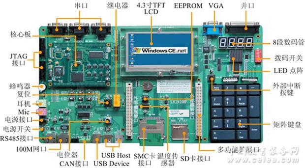 二、系統(tǒng)特點 系統(tǒng)完整性: ★涵蓋嵌入式系統(tǒng)設(shè)計的全部流程。 ★操作系統(tǒng)包括μC/OS-II、Linux和WinCE。 ★實驗內(nèi)容涉及操作系統(tǒng)制作、操作系統(tǒng)引導(dǎo)、底層驅(qū)動編寫、上層應(yīng)用程序編寫。 先進性: ★板載溫度傳感器。 ★具有RS232接口、RS485接口、USB接口、CAN接口、SD卡接口、SMC卡接口、以太網(wǎng)、VGA輸出、LED點陣、AC97接口、矩陣鍵盤。 ★采用核心板加底板設(shè)計。 ★2×96pin歐式座,引出所有總線信號,可擴展以下多種擴展板: (1)DSP6713&USB2.0高速數(shù)據(jù)采集擴展板 (2)FPGA擴展板 (3)GPS&GPRS擴展板 (4)CAN&485通信擴展板(需兩塊配套使用,板上亦有相應(yīng)接口,均可使用) (5)電機擴展板 (6)射頻卡&IC卡擴展板 (7)熱敏滑動指紋傳感擴展板 (8)Zigbee擴展板(需兩塊配套使用) ★采用了Advanced Microcontroller Bus Architecture(AMBA)新型總線結(jié)構(gòu)。 開放性: 系統(tǒng)開放所有軟硬件設(shè)計資源。