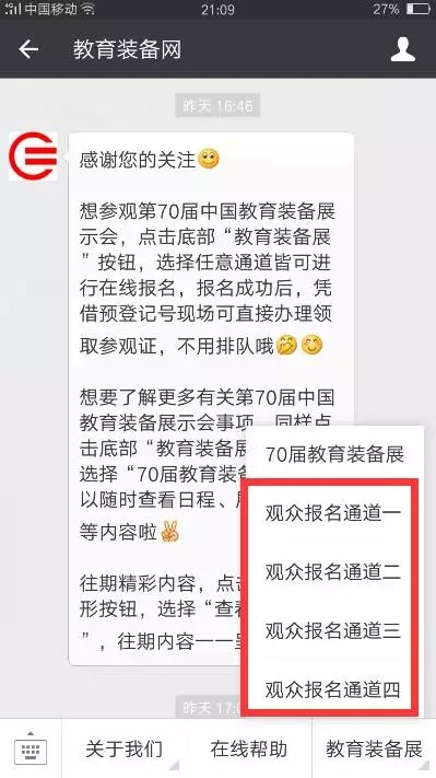 2.進入服務號,點擊底部“教育裝備展”,選擇任意報名通道都可以進行預報名。