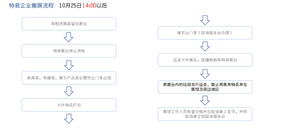 -展會期間,所有成箱的物品出門(包含展品和其他物品)必須先到“現場服務處”開具“出門單”。
