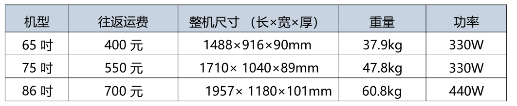 交互智能平板設備單臺往返運費及設備規格(加壁掛厚度增加30mm)如下: