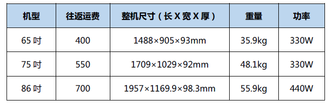 交互智能平板設(shè)備單臺(tái)往返運(yùn)費(fèi)及設(shè)備規(guī)格(加壁掛厚度增加30mm)如下: