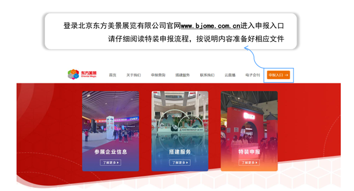 請搭建商登錄北京東方美景展覽有限公司官方網站:www.bjome.com.cn進入申報入口進行申報并繳費完成。