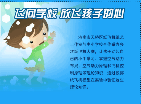 濟南市天橋區紙飛機紙藝工作室所制造的紙飛機的銷售對象不僅是孩子,還有一些成人。他們有的在紙飛機上尋找樂趣,有的是老師作為教學基本模具,讓孩子了解更多知識。紙飛機的制作過程很簡單,可以自己動手完成。大人們可以在制作的過程中找回童年的樂趣,孩子們可以通過紙飛機模型的仿真特點了解空氣動力布局、空氣動力原理和飛機控制原理等理論知識,通過投擲紙飛機模型在實驗中驗證這些理論知識。一般這樣一個紙飛機只需要5分鐘左右就可以制作完成,孩子們可以在在享受樂趣的同時可以通過安裝的每個部件形象、快速的獲取相關知識。