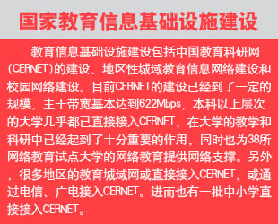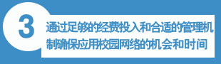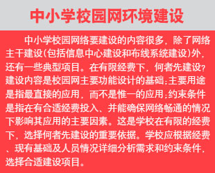學(xué)校應(yīng)根據(jù)學(xué)校的情況,盡可能配備足夠的計算機,并通過合理的管理機制,使要求使用校園網(wǎng)的師生有足夠的時間和機會來應(yīng)用網(wǎng)絡(luò)。此外,校園網(wǎng)應(yīng)專門設(shè)有為學(xué)校師生服務(wù)的遠程接入系統(tǒng),教師與學(xué)生無論身處何地,是在家里、學(xué)校,或是出差在外地,都應(yīng)可以使用校園網(wǎng)絡(luò)。 |