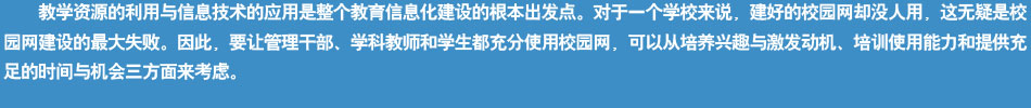 學(xué)校一方面要對各個學(xué)科的骨干教師進行計算機應(yīng)用技術(shù)、計算機輔助教育和Internet應(yīng)用的培訓(xùn),其目的是通過他們帶頭進行應(yīng)用校園網(wǎng)的教學(xué)科研活動;另一方面借助中小學(xué)教師繼續(xù)教育工程,讓廣大教師參加普及性的計算機操作基本技能和現(xiàn)代教育技術(shù)的培訓(xùn),目的是讓所有教師都積極參與到校園網(wǎng)的教學(xué)應(yīng)用中。對于學(xué)生,在課程改革中加入信息技術(shù)課程,培養(yǎng)他們應(yīng)用網(wǎng)絡(luò)輔助學(xué)習(xí)能力。 |